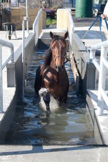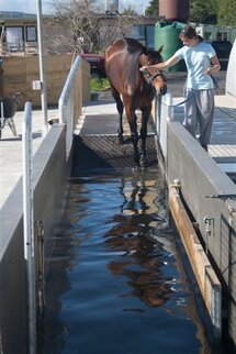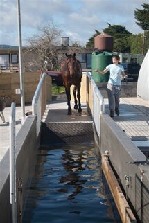 Unlike traditional swimming pool therapy, the horse can exercise in a controlled environment, using its normal gait and the same muscles as in use while exercising on the track without undue stress or trauma.